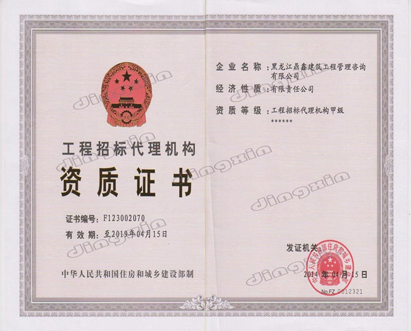 黑龍江鼎鑫建筑工程管理咨詢有限公司成立于2005年,注冊(cè)資金400萬元。具備中華人民共和國(guó)住房和城鄉(xiāng)建設(shè)部批準(zhǔn)的工程招標(biāo)代理機(jī)構(gòu)資格、中華人民共和國(guó)財(cái)政部批準(zhǔn)的政府采購(gòu)招標(biāo)代理機(jī)構(gòu)資格、黑龍江省商務(wù)廳批準(zhǔn)的機(jī)電產(chǎn)品國(guó)際招標(biāo)代理機(jī)構(gòu)資格、中華人民共和國(guó)住房和城鄉(xiāng)建設(shè)部批準(zhǔn)的工程造價(jià)咨詢甲級(jí)資質(zhì)、黑龍江省住房和城鄉(xiāng)建設(shè)廳批準(zhǔn)的房屋建筑工程監(jiān)理乙級(jí)(市政公用工程監(jiān)理乙級(jí)資質(zhì))。主要從事建設(shè)工程及政府采購(gòu)招標(biāo)、造價(jià)咨詢、工程監(jiān)理、項(xiàng)目管理等業(yè)務(wù)。